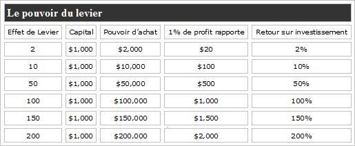 Le levier offert par les brokers sur le marchés des devises permet de prendre des positions pour des montants plus élevés que le capital que l’on possede. Les traders se retrouvent donc souvent au controle de sommes d’argents importantes avec peu de capital avancé au depart. Par exemple, une somme de $1000 avec un effet de levier a 150 permet de passer un ordre de $150,000 sur le marché des devises. Certains brokers proposent des leviers allant jusqu’a 400!