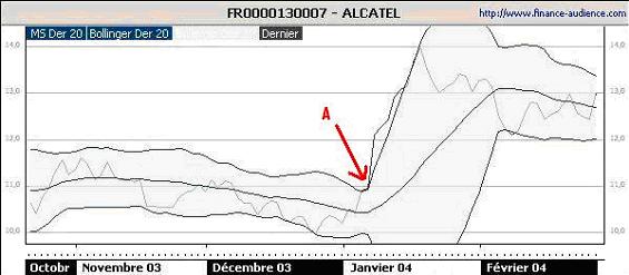 · Un fort resserrement des bandes de Bollinger autour de la moyenne mobile annonce un changement de tendance (point A sur le graphique). Le gonflement des bandes autour de la moyenne mobile est proportionnel à la force de cette tendance.