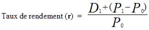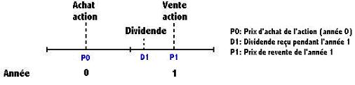 Utilisons maintenant un exemple concret pour mieux cerner la méthode de calcul du taux de rendement exigé: à une certaine période de l’année 0 vous achetez un titre au prix de $100. Au cours de l’année 1, vous recevez un dividende de $10 et revendez votre titre 2 mois plus tard pour un prix de $120. Pour calculer le rendement de l’investissement réalisé, il s’agit de mettre en relation la somme finale reçue avec le montant dépensé à l’achat.